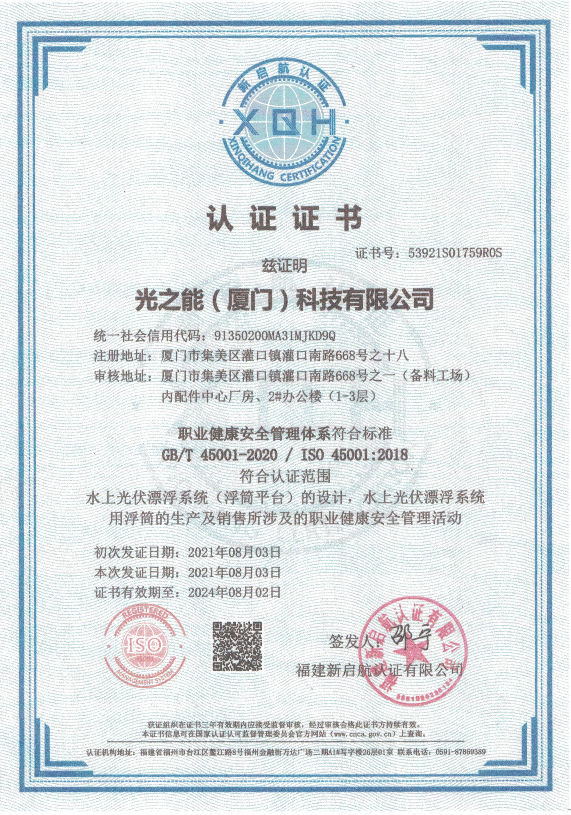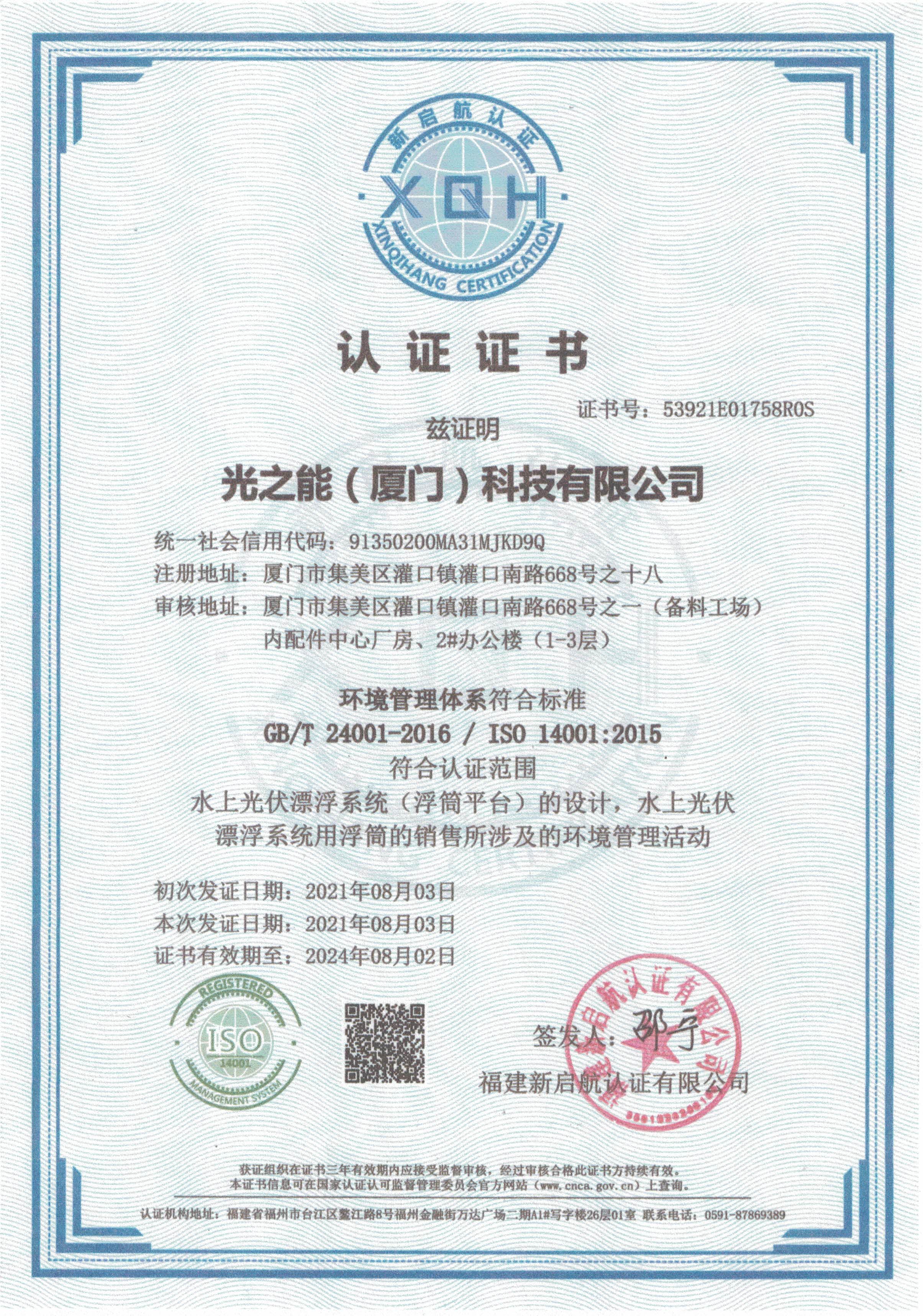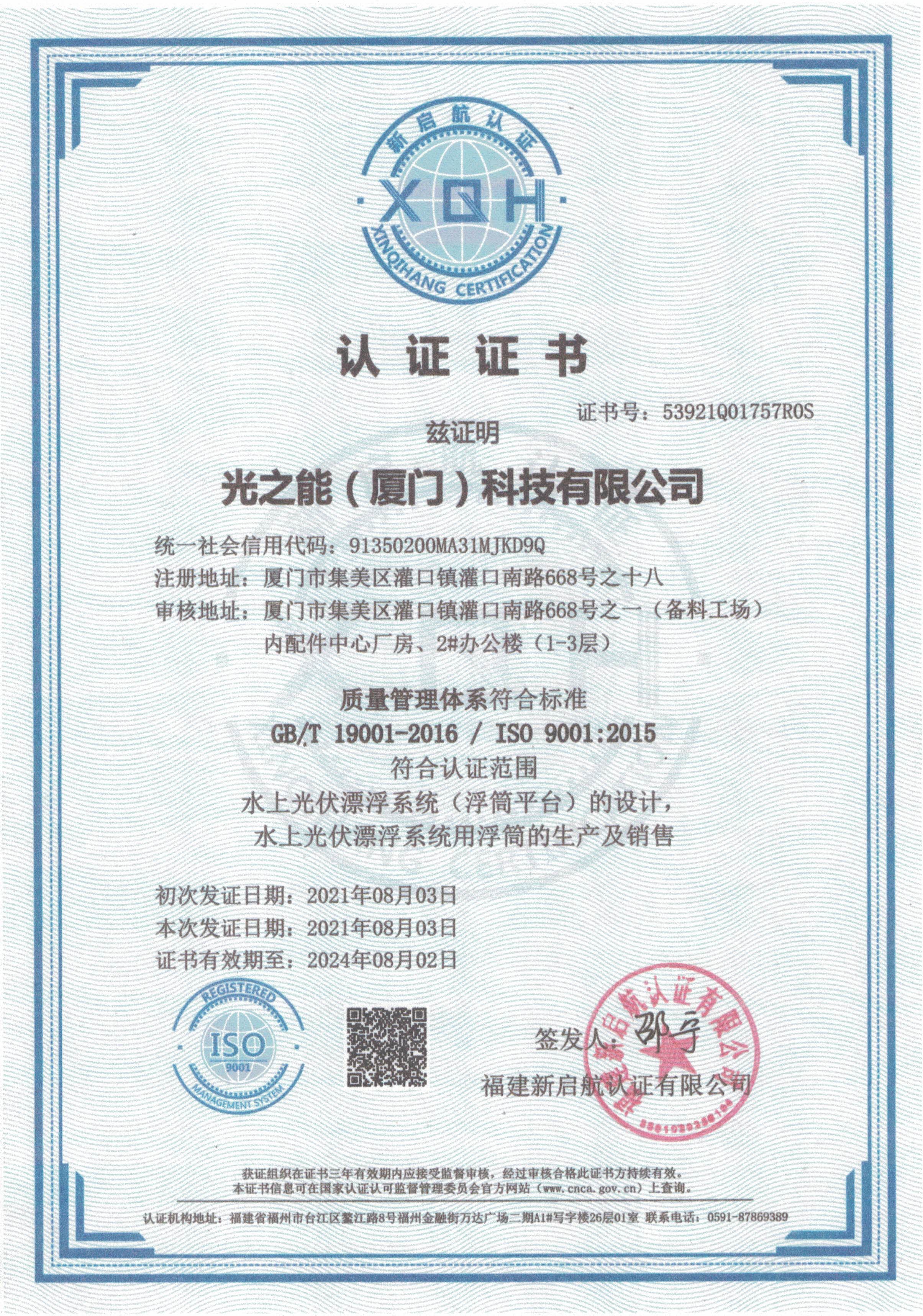光之能(厦门)科技有限公司成立于2013年,总部位于中国厦门,是一家最早进入漂浮光伏电站领域的企业之一,目前已发展成全球技术领先的光伏漂浮系统解决方案提供商。公司是一家集研发、生产、营销、运维及服务为一体的新能源领域国家级高新科技企业。公司秉承“让更多人用上便宜的绿色能源”的品牌理念,以人为本,科技创新,为全球客户提供值得信赖的产品及高效、专业的服务。